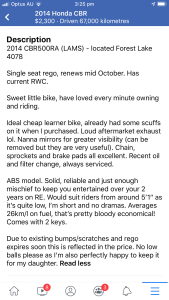 The buyer didn’t want to test ride it (Mr was all ready to kit up and follow him in case haha) just straight in, hand over cash and ride off. Being a polite Marketplace seller I did let the other interested buyers know it had sold, at least one disappointed but slow moving buyer missed out on a bargain.
